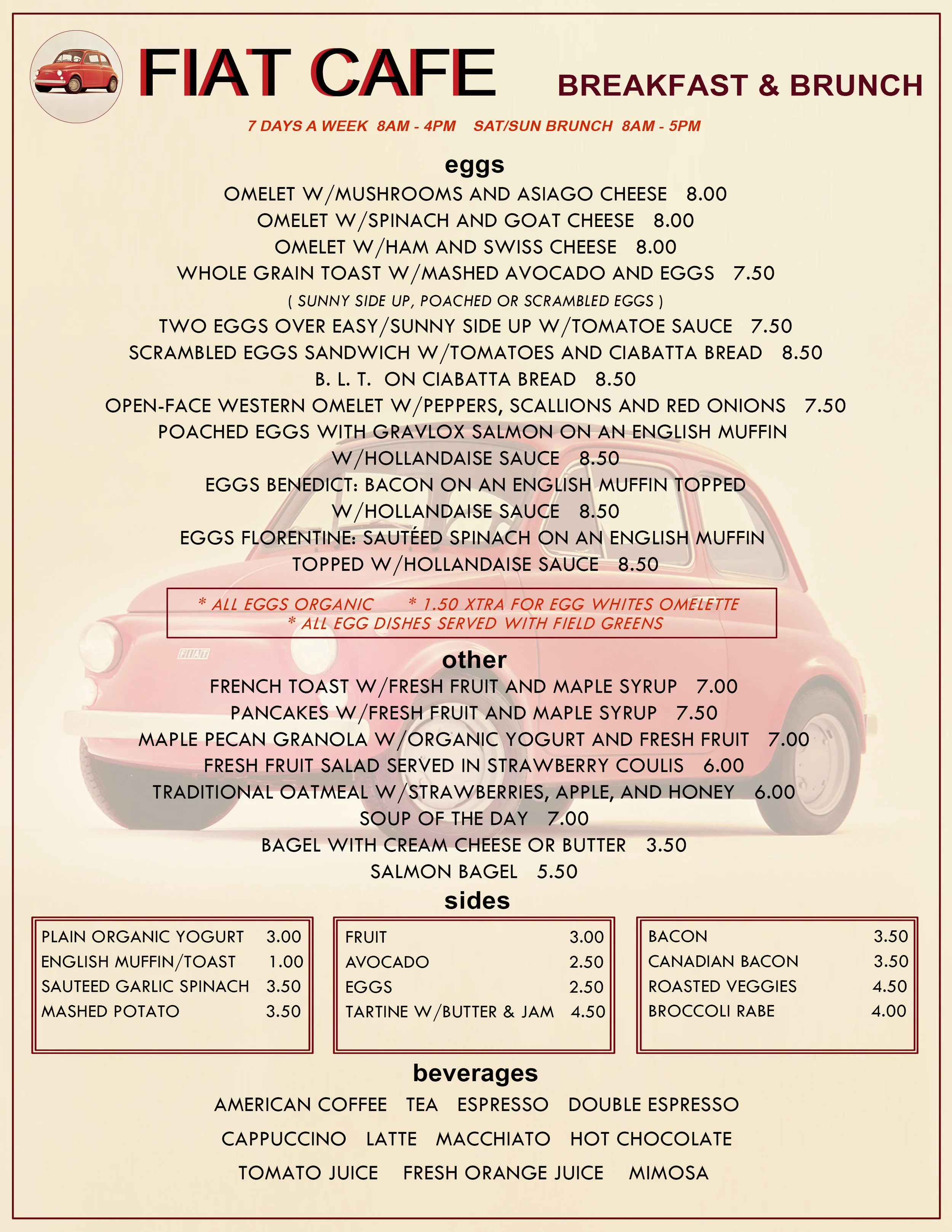 Breakfast/brunch menu layout and design for Fiat Cafe.